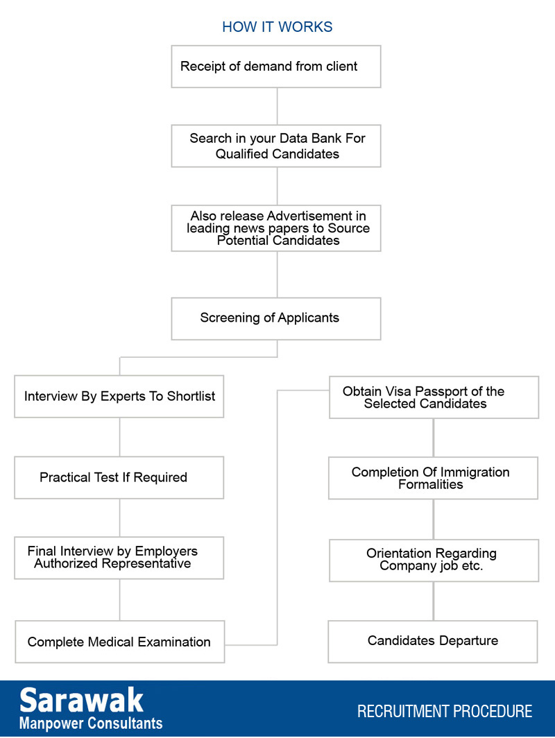Most of our Clients have their own ways of selection and assessing competence levels of candidates and usually like their own technical experts to visit initially to set required standards and procedures to be followed in future selections. We always encourage this practice to understand the system which always helps us to maintain our association with the clients in a professional and mutually acceptable manner, even though our recruitment manager's are capable of handling recruitment at all levels, including screening, short listing, pre-selecting and finally selecting the right candidates, as per the Client’s given job descriptions.